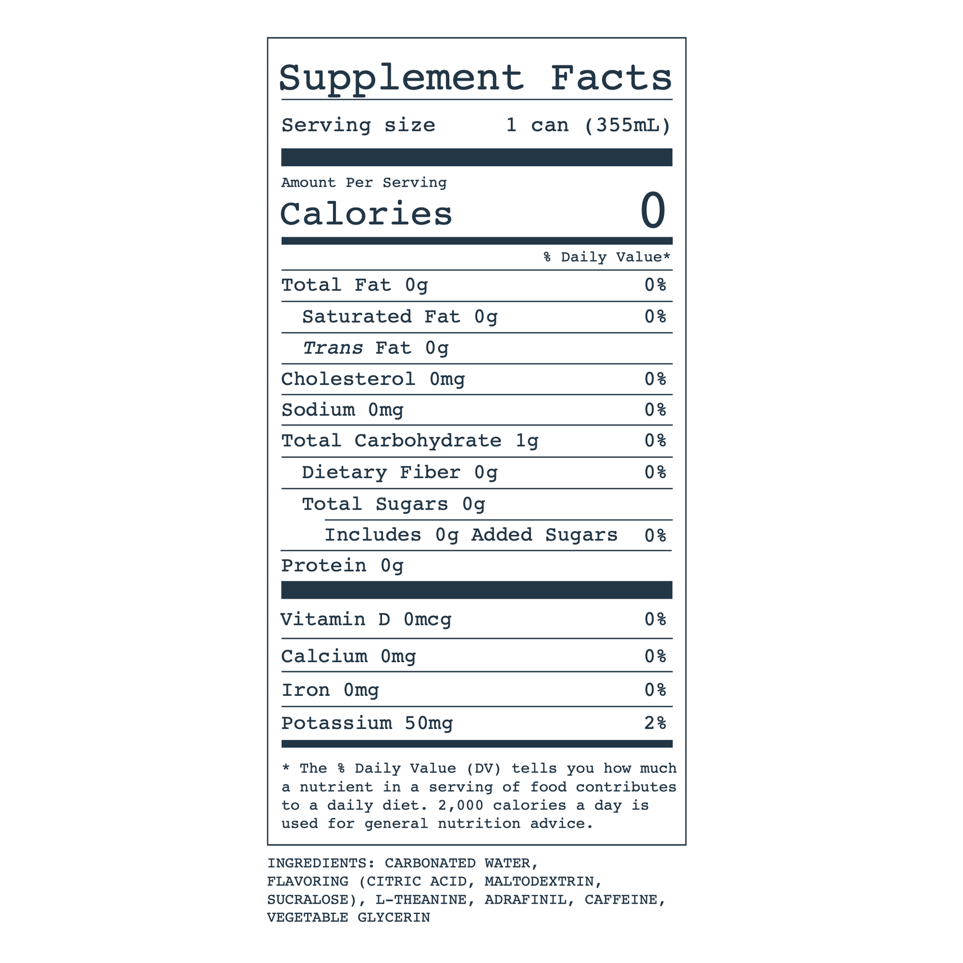 100mg caffeine. 150mg adrafinil. 200mg l-theanine. 0g sugar. 0 calories.